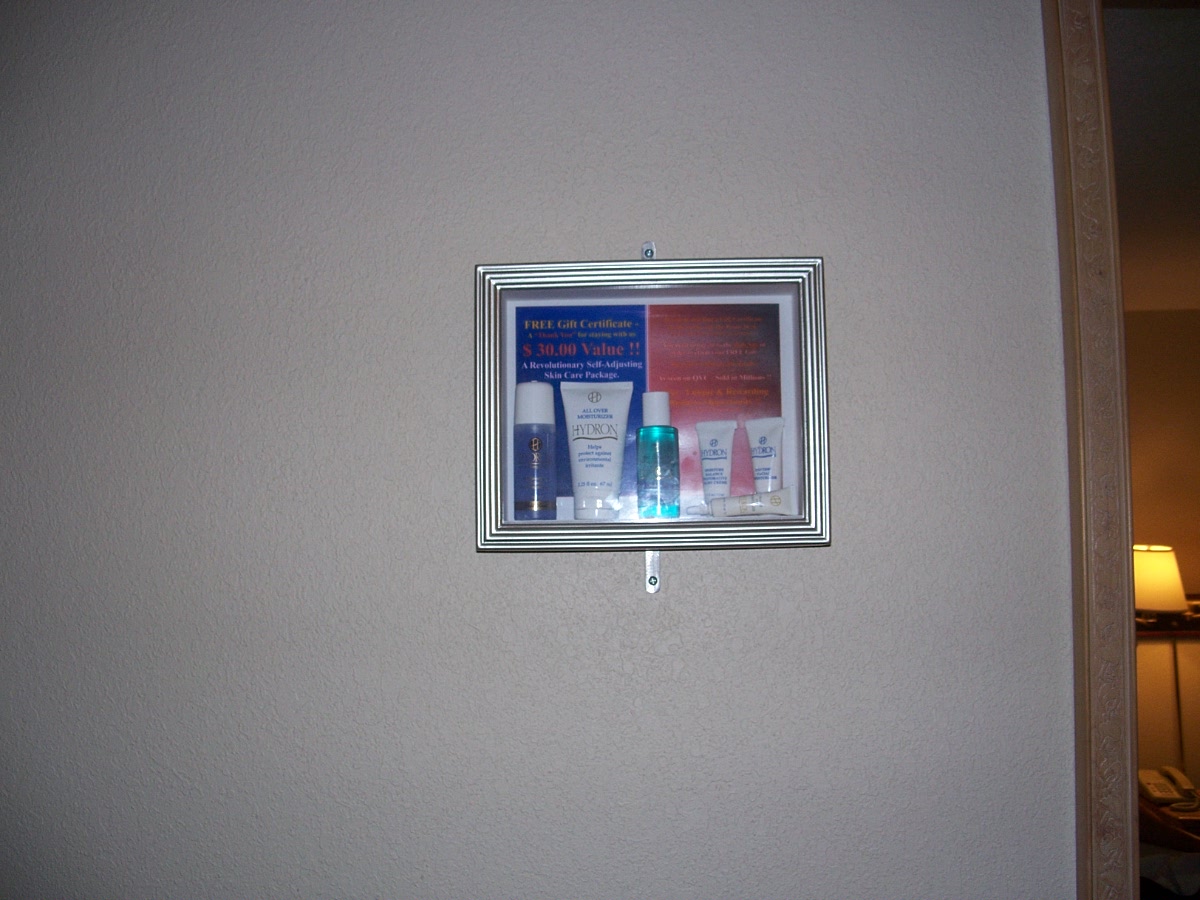 toiletries(Click on any of the pics to see them full size) They have the really good toiletries bolted to the wall in a glass case. Are we supposed to break this in case of an emergency? There’s also a little slip of paper (a Notification of Exemption to Sanitization Requirements) laying next to the drinking glasses. It lets us know that although the glasses have been cleaned using “household dishwashing agents” they haven’t been sanitized according to Federal and State standards for public food service establishments. My mother sent me a video recently covering how hotels in Atlanta “clean” their glasses. It’s gross. So, I look at these glasses, and sure enough, there is a lipstick imprint on the first glass I pick up. And they were washed? Even with dawn and a rag you could get a lipstick imprint off. We’ll be using the plastic covered paper coffee cups.