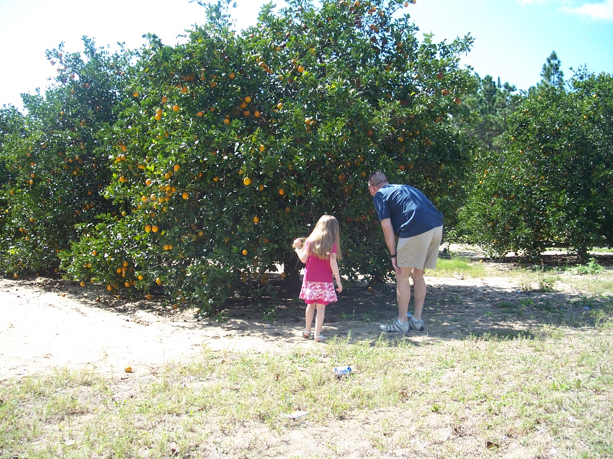 Picking Finding an orange in our neighborhood orange orchard. This is before we headed out to Downtown Disney.