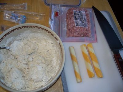 My genius item (go with me here people) was what I made with the Bisquick batter. I’m going to post pictures and instructions. Toni does this over at The Happy Housewife all the time and I’m thoroughly impressed. So here goes my attempt: