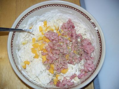 Then dice them. Throw these into the batter along with a handful of ham chunks. Add some garlic powder and rosemary.