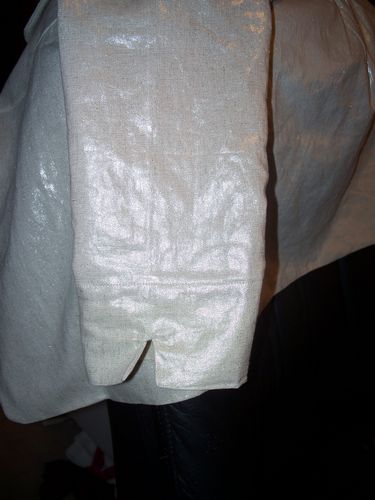 A close up of the slit in the sleeve. That was the hardest part–figuring out how to turn it from inside out to right side out. I love the shiny material. Du’s not so hot on it. But, he doesn’t have to wear it does he? He must stand by me though when I’m showing it off.