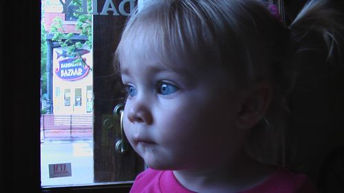 Ashlyn wanted to bowl too so she took a couple of toys and threw them at the bowling lane.