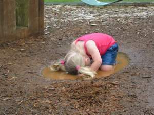 As for last week’s pic…I had you fooled! You guys thought that was Ashlyn (except for my mom who really can tell my kids apart and Cher who witnessed the event). IT WAS REAGAN! I know! That is so like Ashlyn to do so I see how you’d get mixed up. And Reagan’s insanely long (for a two year old) pig tails are being hidden by the mud. We were visiting our dear friends in Atlanta and we took our kids to the playground. Reagan loves water, but I didn’t know I’d have to worry about her wallowing with the pigs. Talk about a prodigal daughter. She saw the mud puddle and immediately went for it. In fact here you go: