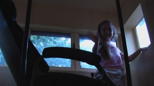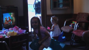 Next, she’s at the kid-sized, plastic rocking horses, which she dragged over to the tv.