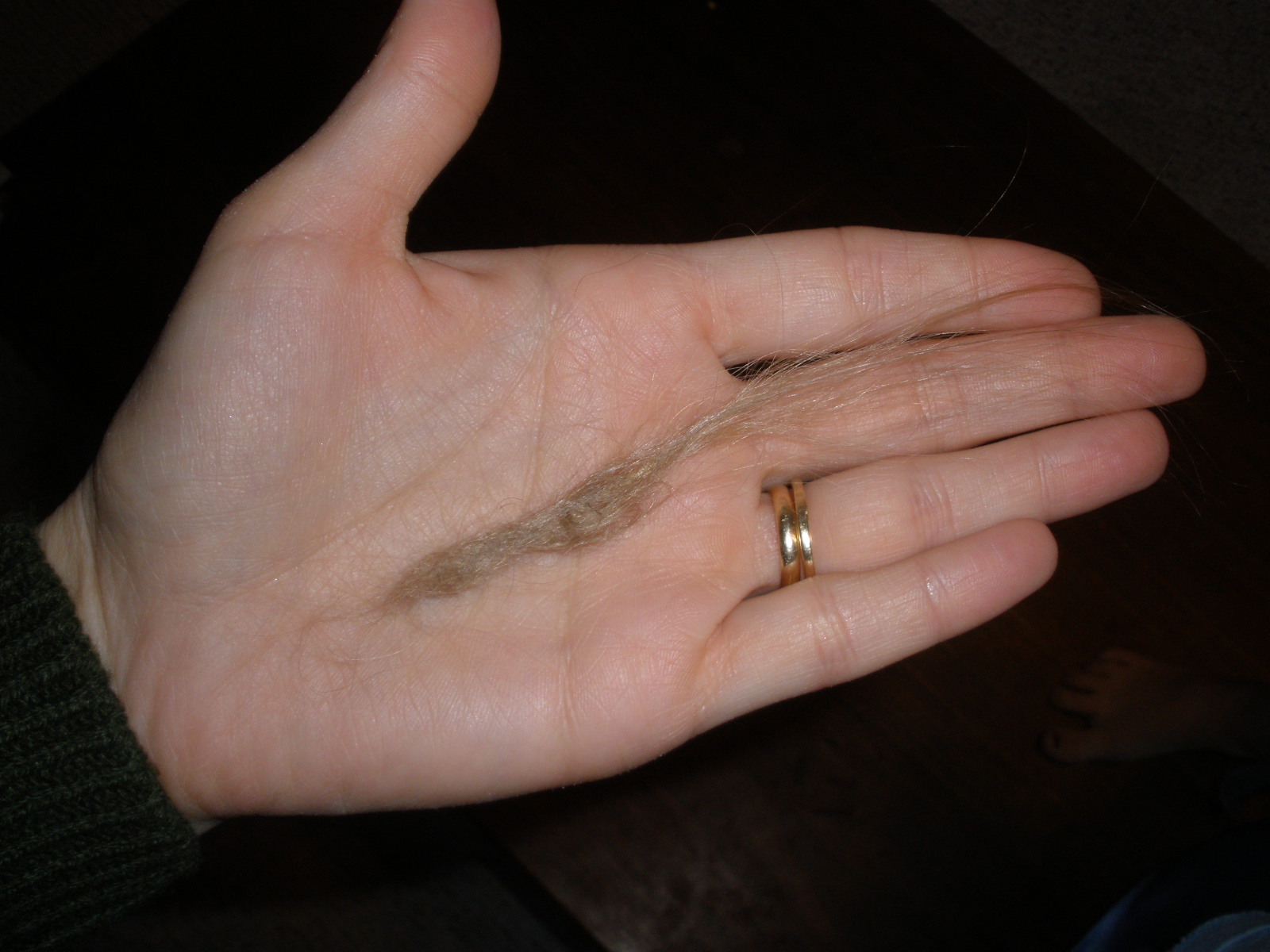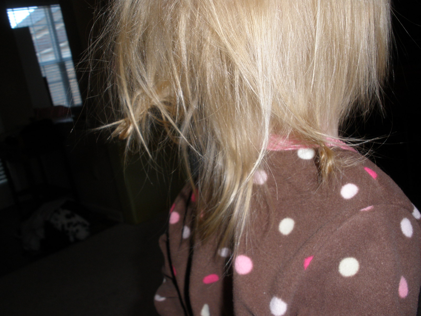What I’m realizing is that there’s actually a very scientific reason behind the amazing overnight dreadlock growth and overnight dreadlock death. When she twirls her very fine hair into a little knot some of it is actually pulled from her head, but it gets wrapped up in the knot. I try to work the knot out every morning, but never manage completely. Yesterday she had managed to work all that extra unattached hair into a longer rat tail like substance. Almost like spinning cotton into yarn.