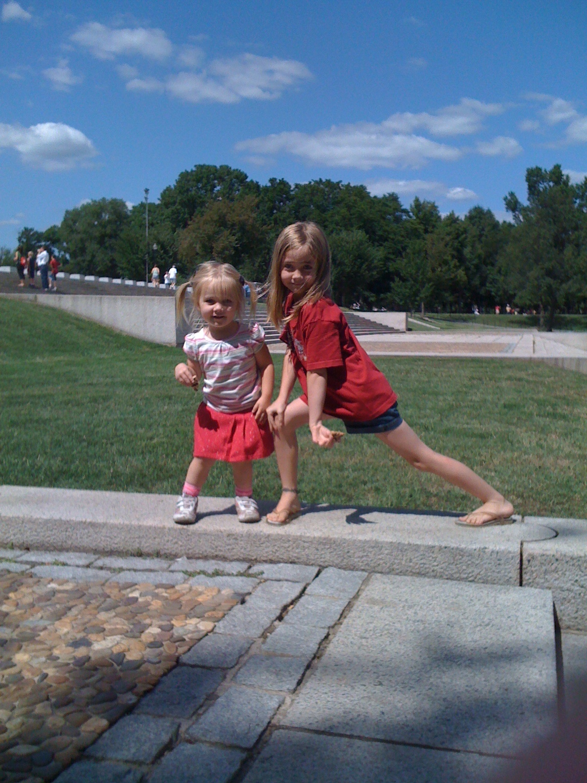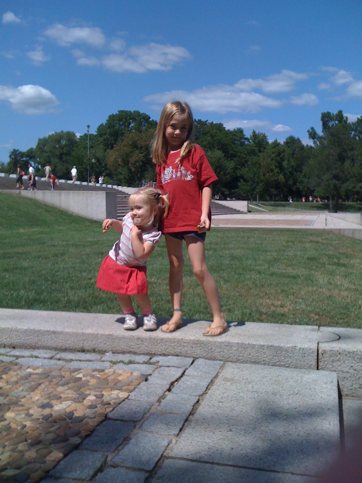 It couldn’t have been a better day to dine al fresco near the reflecting pool between the Washington Monument and the Lincoln Memorial. We picked a spot on the lower steps, closer to the pool, and made ourselves comfortable. For Ashlyn and Reagan this meant barely eating as they were more interested in playing on the stairs. No bother, the beautiful sky and fresh air allayed any anal desires to have them sit still and just eat their lunch already.