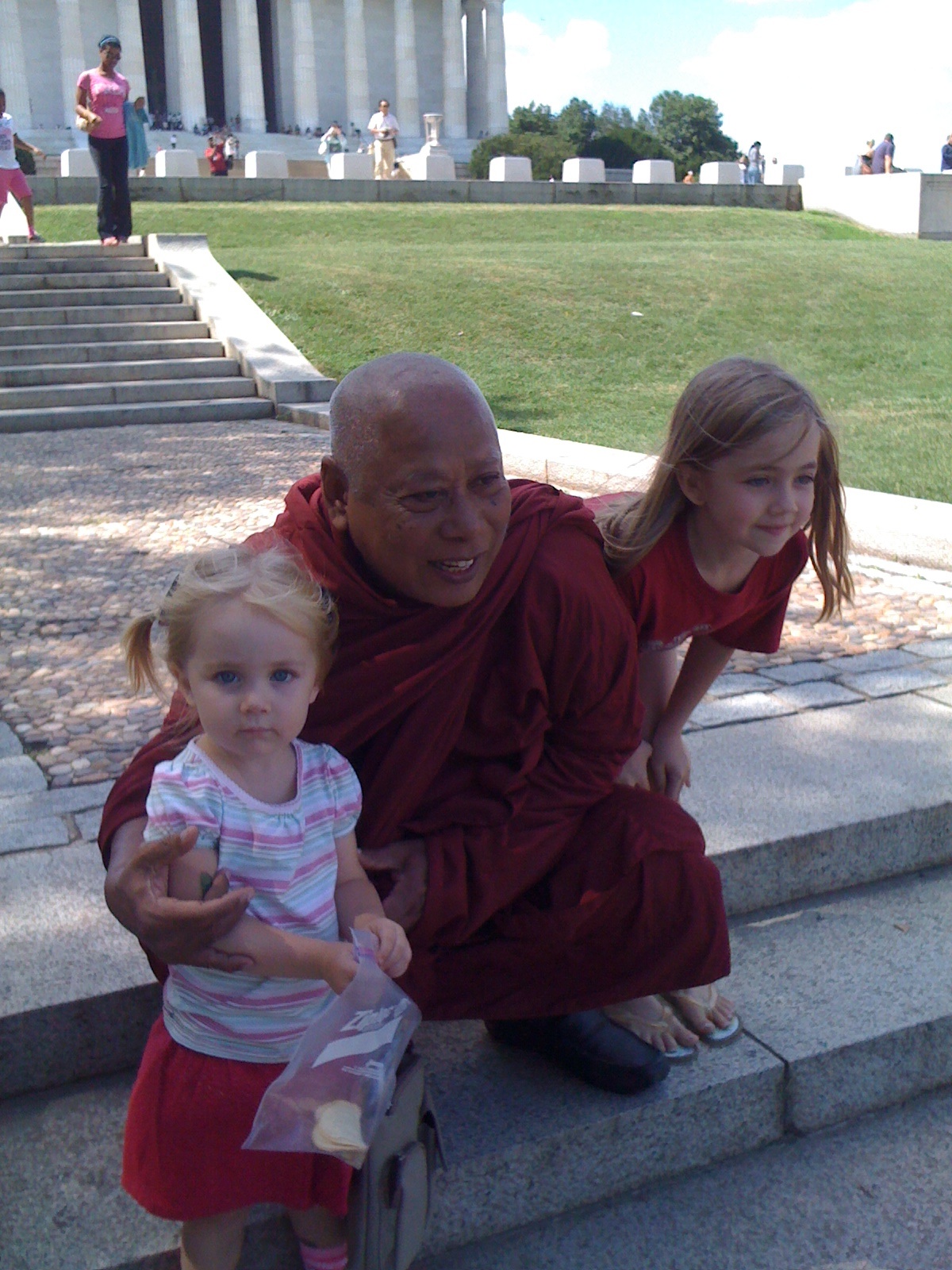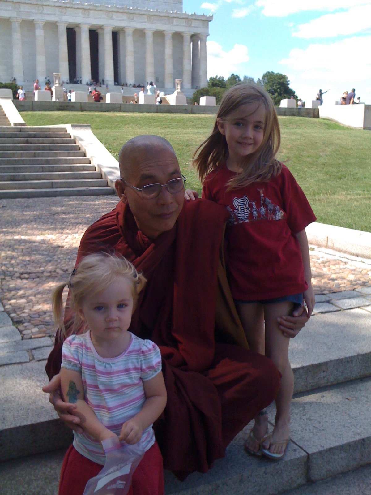All of this was taking place on the steps right in front of the reflecting pool. Other people were coming and going. One family saw the exchange and the daughter ran down and tried to ask one of the monks, as they were walking away, if she could get her picture taken with them. They just kept on walking. After her parents caught up with her I heard the mom complaining to the dad that they didn’t even pay attention to the daughter. I butted in here and explained that they didn’t speak English, they weren’t being rude. At this point the dad goes, “that was the Dalai Lama.”