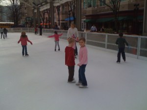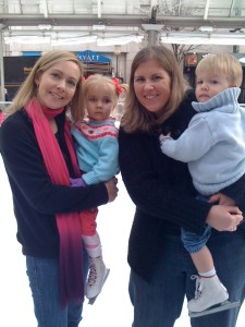 Here we are with the lead weights we had to carry as we ice skated around. Notice the two little sugarplum fairies have skates on as well, but they thought it’d be more fun to give their mommies back problems.