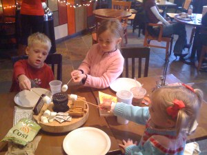 After working up an appetite on the rink we headed over to Cosi for lunch and S’mores. Look at the cute tabletop S’mores kit! I know! Julie, I ended up ordering one of these. It came today and so tonight I thought of you as we enjoyed S’mores in our own living room. During lunch poor Jasper burned his finger on the lava-hot little grill thing and so our meeting came to an abrupt end.