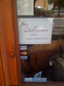 • restaurants and stores — reminds me a lot like Europe as well. Outdoor cafés, dogs at those cafés. Outdoor stores (as opposed to stores in malls), dogs in those stores. Here’s an example: