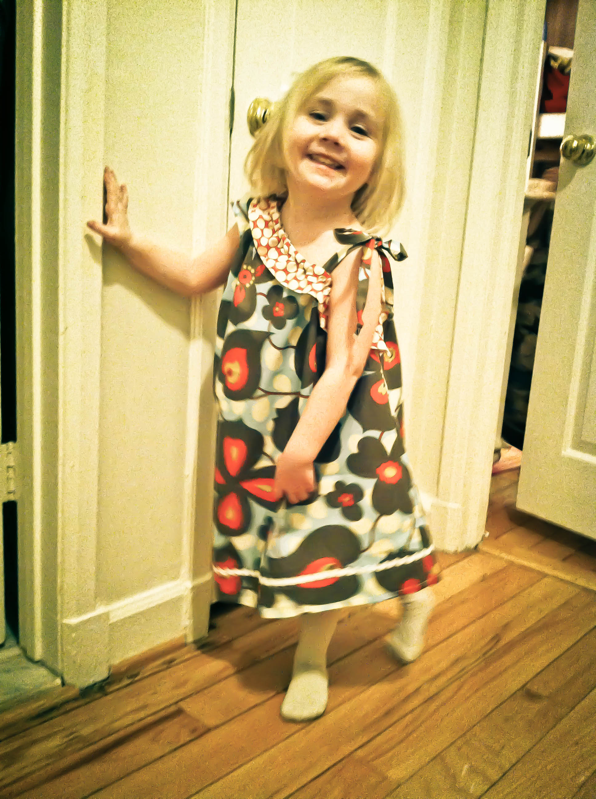 I got the idea and pattern from Prudent Baby. It hangs a little weird on Ash, but when she’s wearing it I doubt she’ll stand still very much, so no one will be able to tell…