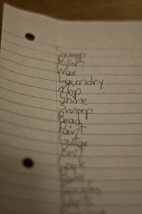 So much so that they had written out lists of all the chores they wanted to do. There are words on there that I don’t quite know the meaning of. “Shine”? What does that mean? I don’t ever do that. “Polish”? As in polish furniture? If you want to talk about Polish pottery I’m all ears, but get me away from furniture polish.