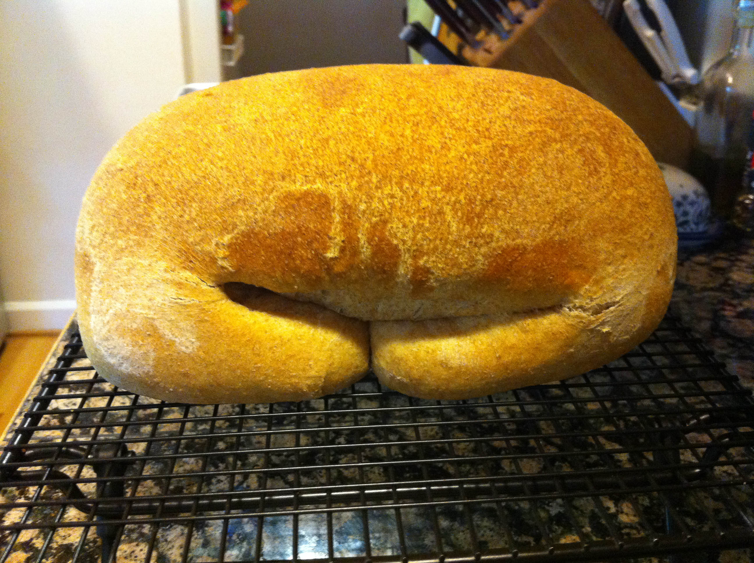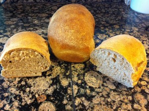 I believe this is my first foray into oven-baked bread. I’ve tried making bread several times in a bread machine and it always comes out dense and hard to cut. If I’m going to make bread for us to eat I want to be able to slice it. My family still consists of Americans and, shove it Europeans, we like our bread soft and sliced. I’m so amateur at this I don’t even have bread pans yet. I had to make do with a small baking pan I’ve got…it’s probably meant for brownies. But this was the result…free-form loaves: