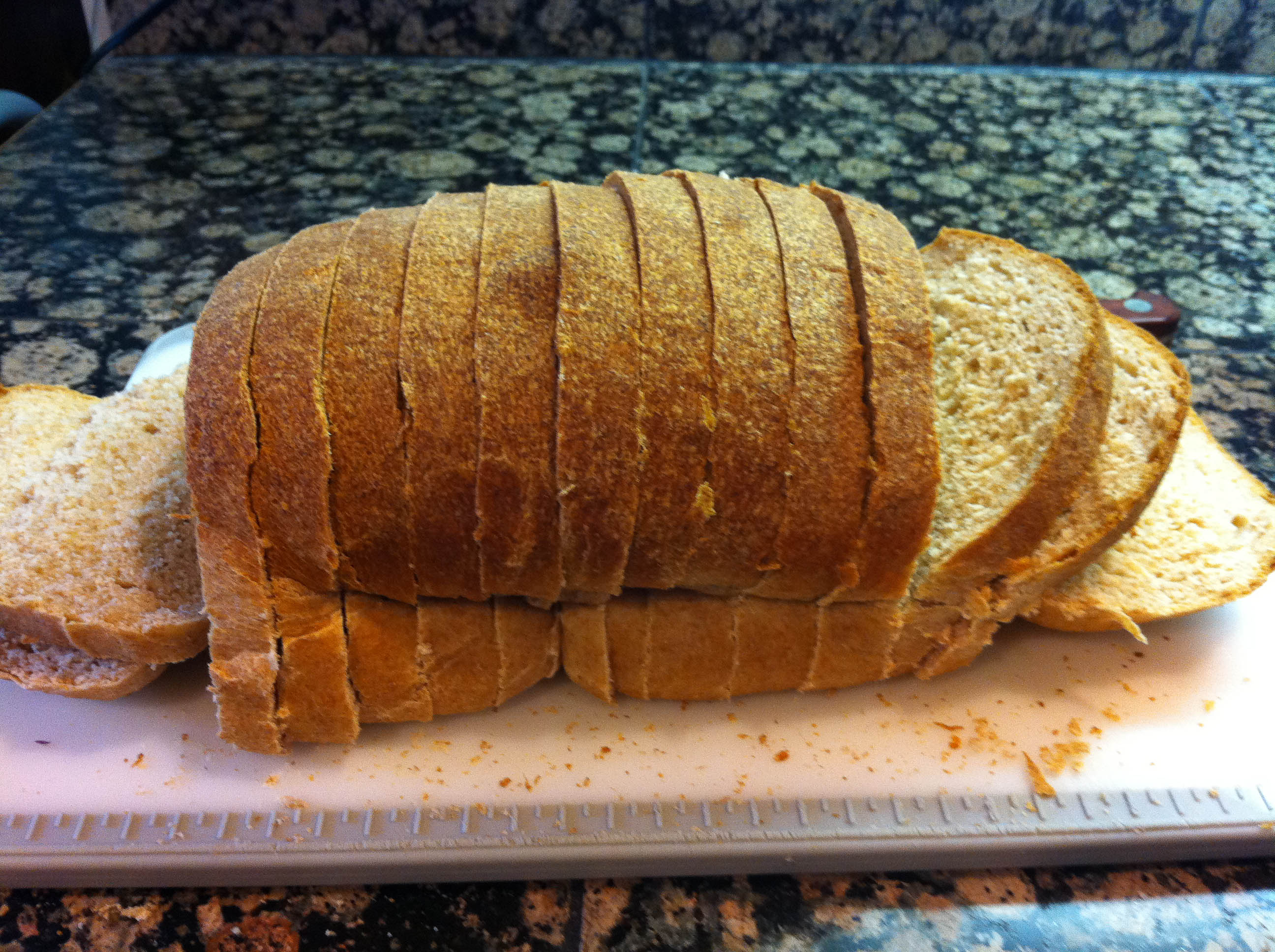 They are honey wheat loaves made with local honey. They ended up being a little bit heavier than grocery store bread but nowhere near as heavy as the bread machine bread I’ve made before. They were easy to slice as well: