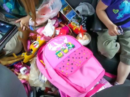 At the end of the trip Du was having to lift Ashlyn out of her seat and put her back in when we made a stop. And it wasn’t like it took the whole trip for the girls to trash the back seat. This is after two days of travel. I’m so glad we didn’t get ants. Sometimes it’s better just to not look behind you.